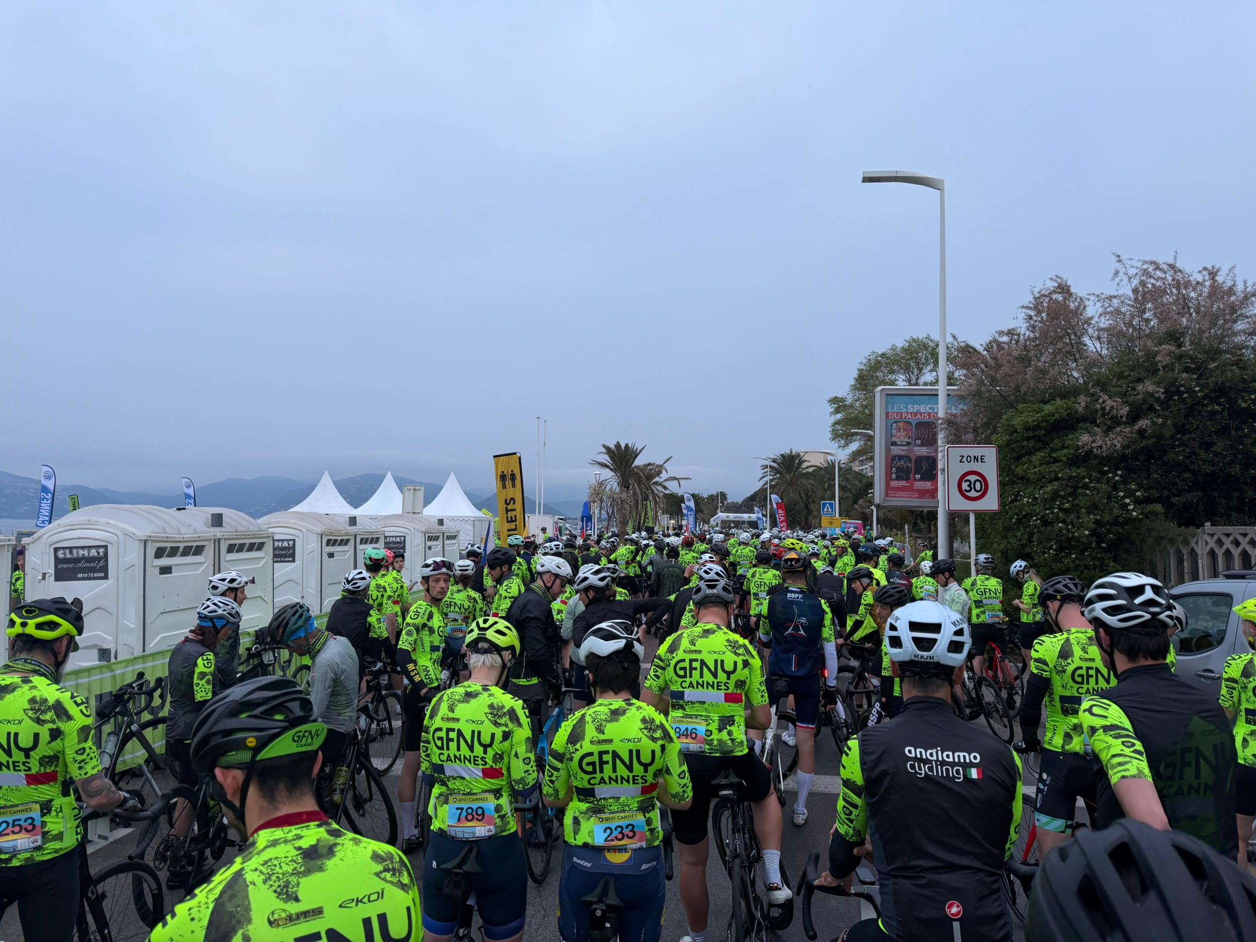 Il est 7h30 sur le Boulevard du Midi, en bord de mer, le long des superbes plages de Cannes La Bocca. Habituellement lieu privilégié de la jet-set, l’ambiance est tout autre en ce dimanche 12 avril : prêt de 800 cyclistes sur le parcours long et une centaine sur le moyen attandent dans le sas de départ avec un objectif, « be a pro for a day ».