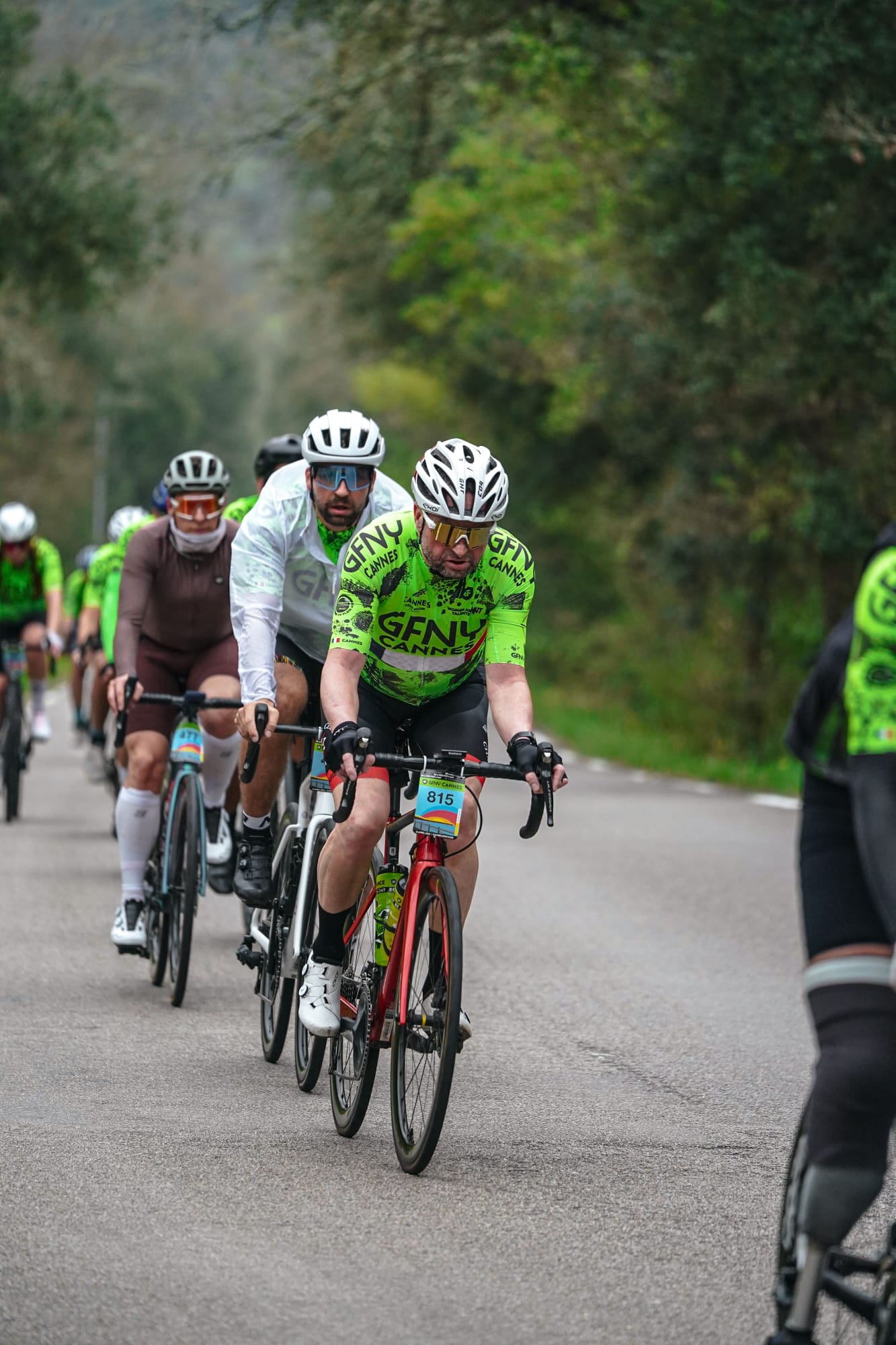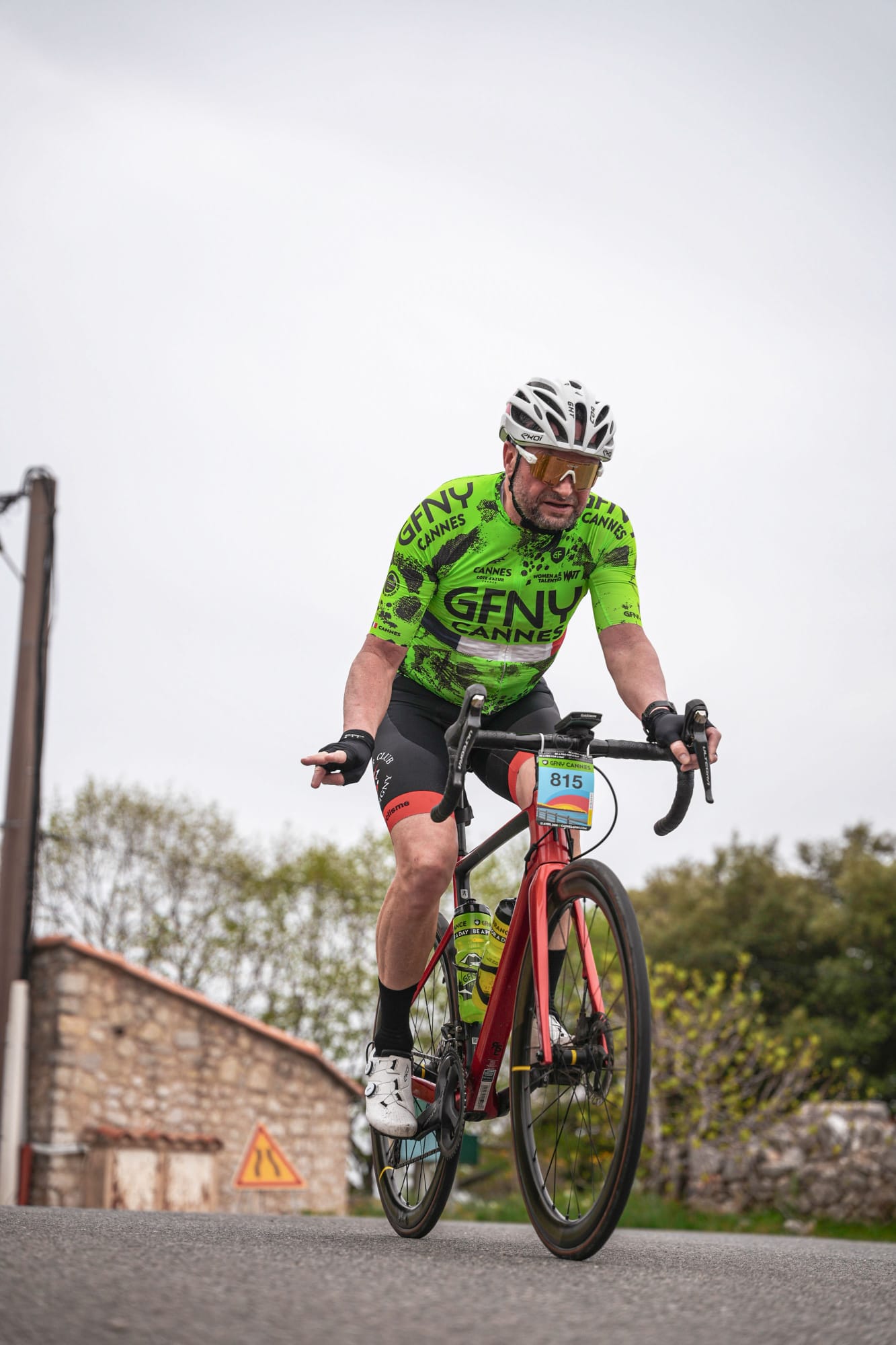 Le décor est planté, le départ est donné ! Sur un rythme soutenu, les premiers km de plat pour sortir de la ville demandent de la concentration : il s’agit de se faire une place dans un peloton très dense tout en évitant les chutes liés au mobilier urbain (ronds-points, séparateurs, rétrécissements de chaussée…). Puis, dans le cadre plus sauvage de l’arrière pays arrivent les premières difficultés. A ce stade, le peloton se morcelle et chacun cherche à gèrer son effort. Les montées s’enchaînent sur un bon tempo, tout se déroule sans accroc pour les membres du RSCC, les sensations du moment sont bonnes. Attention cependant aux descentes avec des routes étroites – au revêtement parfois douteux – qui peuvent s’avérer piégeuses. Mais fort heureusement aucun incident à signaler. Particularité cette année, l’arrivée est prise en compte au km 100 au sommet du Tanneron, emprunté une seconde fois avant la redescente progressive vers la côte et le retour sur Cannes.